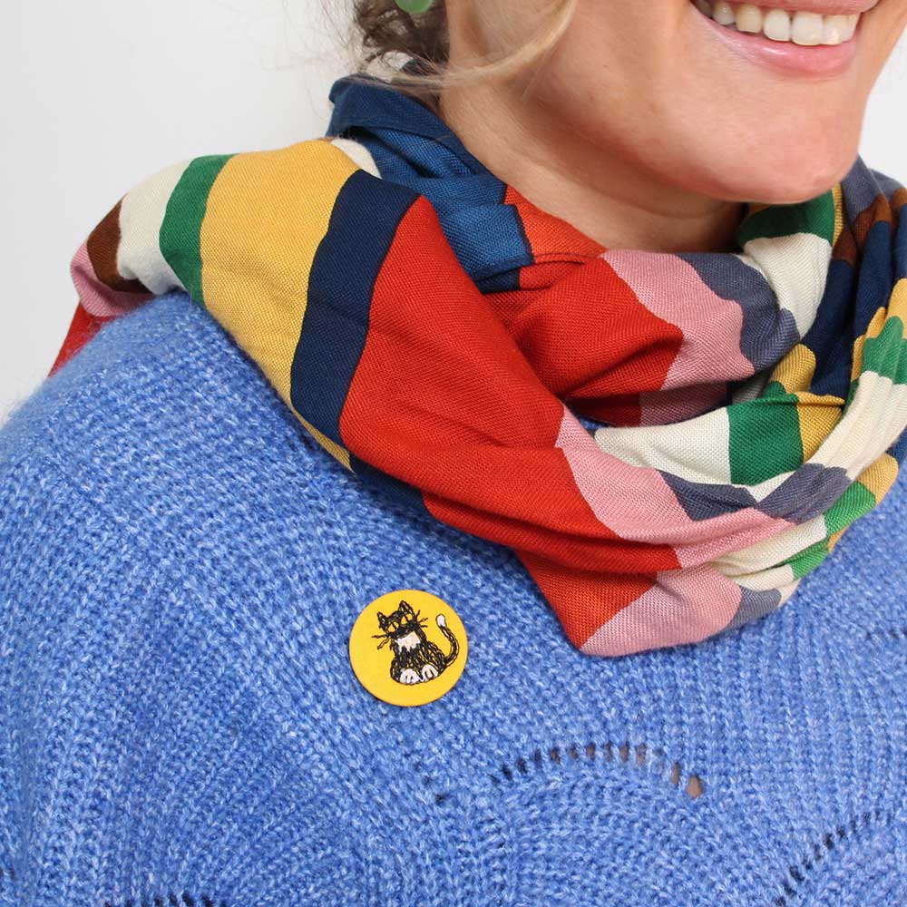 A bright and playful little cat lovers badge, this yellow cat design is a cheerful addition to jackets, bags or scarves. It’s a lovely small gift for cat lovers, or a fun detail to add to everyday outfits.
