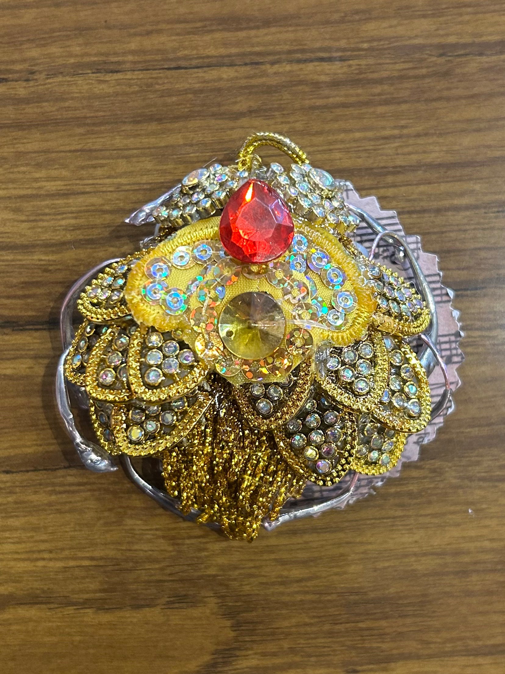 A striking Jan Cooper beetle brooch featuring intricate diamanté embellishment in warm gold tones, finished with a bold red faceted stone detail. Rich in texture and sparkle, this statement piece adds personality to coats, knitwear or occasion outfits.
