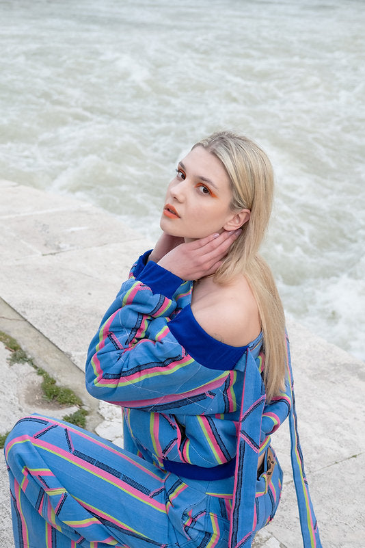 KARDASCIAN (off-shoulder kilted bomber jacket in kente)