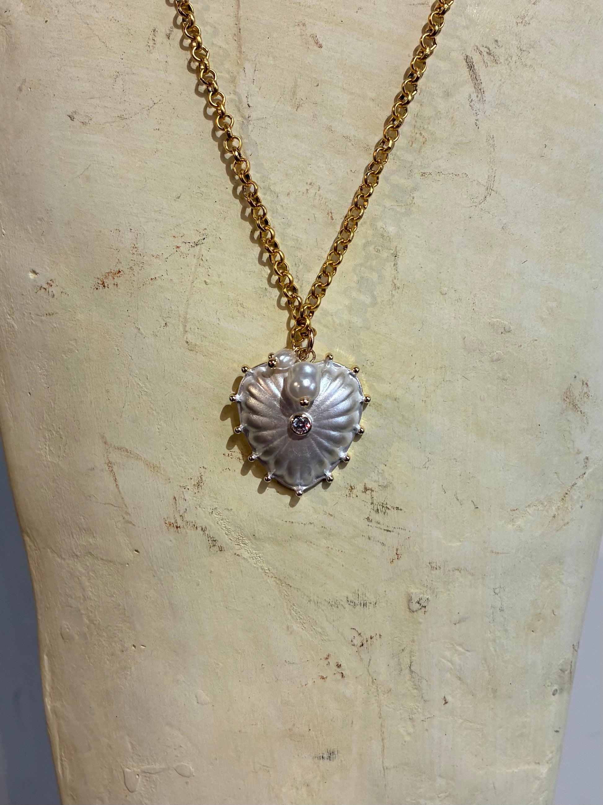 A romantic Pom di Pom statement necklace featuring a sculptural heart pendant in a soft silver-tone finish, detailed with a central pearl and delicate crystal accent. Suspended from a classic gold-tone chain, this elegant piece blends vintage inspiration with contemporary styling.